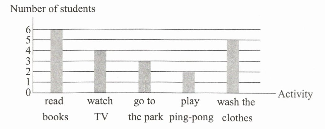 3 Nancy 抽出一天时间调查了 20 名同学在假期周末常做的事情,并将结果绘制成条形统计图。请根据统计图判断下列句子的正误,正确的写“T”,错误的写“F”。