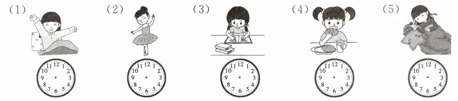 (1) 起床,时间是 7 点,时针指向 7,分针指向 12。
