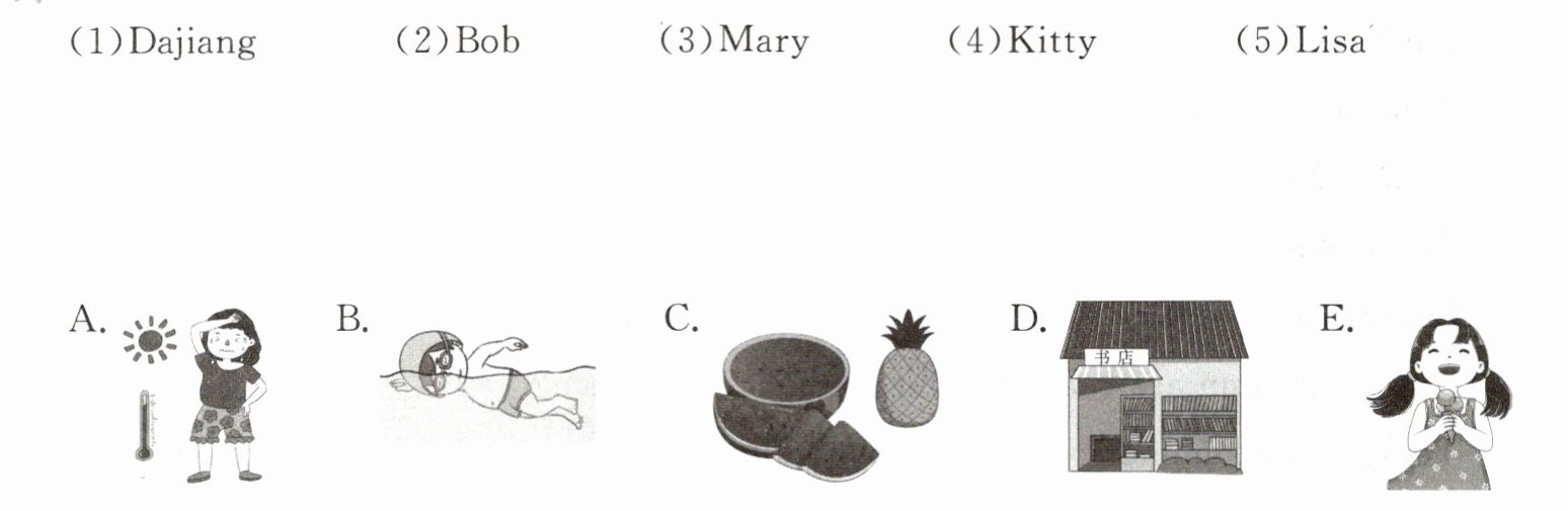 2 正值炎炎夏日,大江和朋友们喜欢夏天吗?听对话,将人名与相应的图片连线。