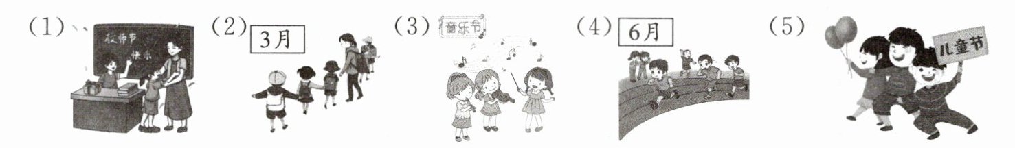 3 看到学校英语派对的照片,Amy想到其中的“节日知多少”问答环节。请在横线上填写相应月份的单词,并为句子选择相应的图片,将选项写在括号里。
