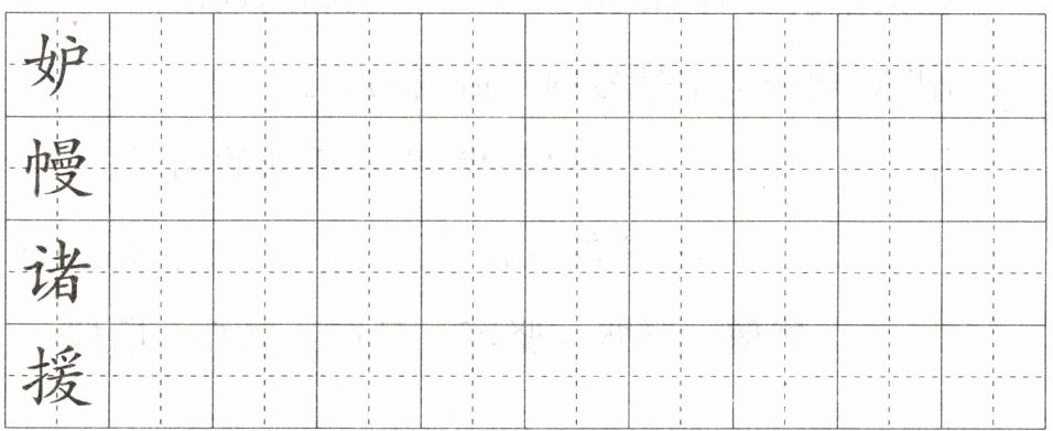 按照左右结构的书写要点,认真练习“妒”“幔”“诸”“援”这几个字,注意笔画的规范和结构的合理安排,通过反复练习达到书写工整、美观的效果。