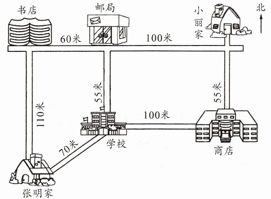 (3)张明从家向()走()米到学校,再向()走()米到商店。