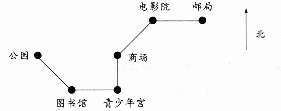 从公园出发向东南方行驶到图书馆,从图书馆向东行驶到青少年宫,从青少年宫向北行驶到商场,从商场向东北方行驶到电影院,最后从电影院向东行驶到邮局。