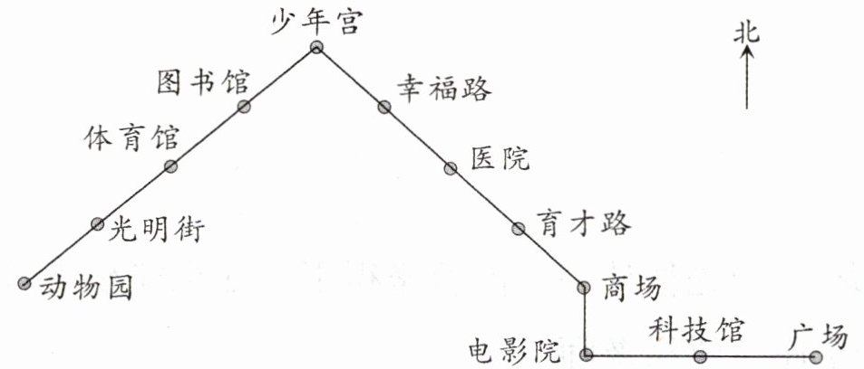 - (3)西、电影院、北、商场、西北、少年宫、西南。