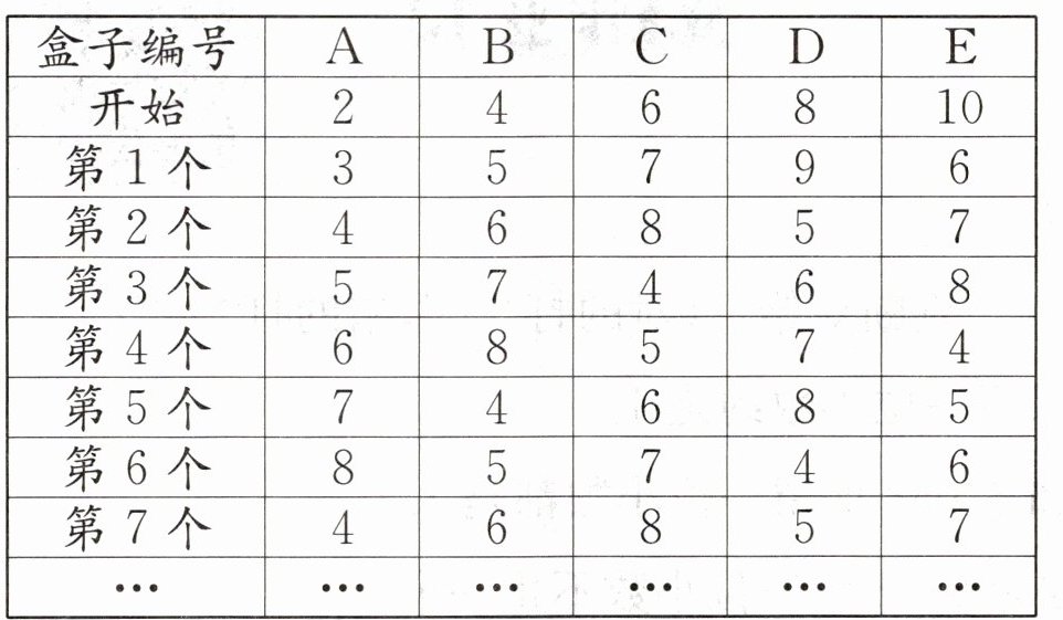 发现除第 1 个小朋友外,第 2 个小朋友到第 6 个小朋友给 A、B、C、D、E 五个盒子放球的结果构成一个周期,这样就可以求出当 2014 个小朋友放完后,E 盒中放有的球的个数。