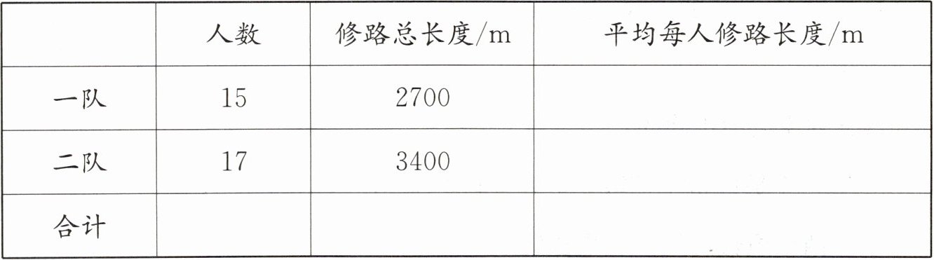 | | 人数 | 修路总长度/m | 平均每人修路长度/m |