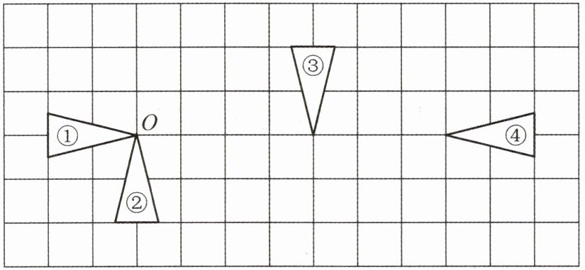 图形①向右平移$4$格,再绕点$O$逆时针旋转$90^{\circ}$得到图形③;图形①向右平移$8$格,再绕点$O$顺时针旋转$90^{\circ}$得到图形④。