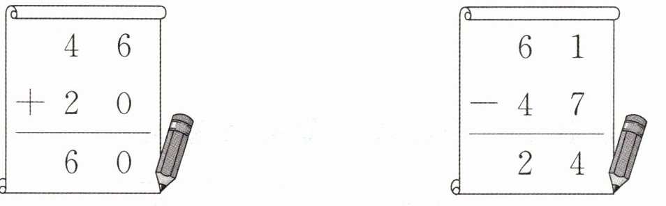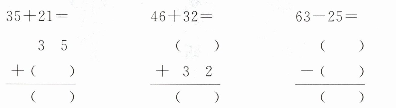 $\begin{array}{r}35\\+21\\\hline56\end{array}$,$\begin{array}{r}46\\+32\\\hline78\end{array}$,$\begin{array}{r}63\\-25\\\hline38\end{array}$