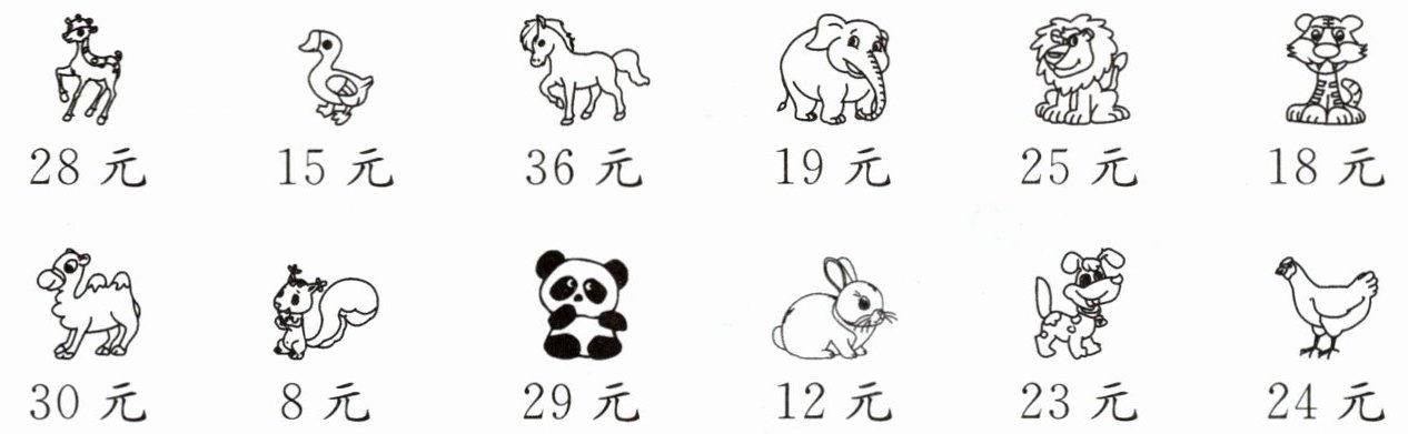 - (2)因为$12 + 18 = 30$(元),$8+22$(无$22$元工艺品),$15 + 15$(同一件工艺品不重复换),$28+2$(无$2$元工艺品)等,通过计算可得$12$元(兔子)和$18$元(老虎)的两件工艺品价格之和为$30$元,所以一件骆驼($30$元)刚好能换兔子和老虎这两件工艺品。