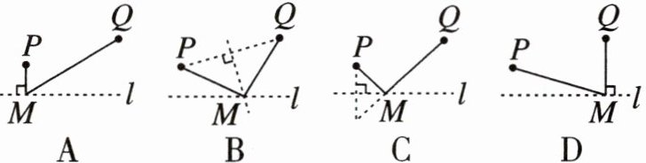 1. (2025 开州区开学) 直线 $ l $ 是一条河,$ P $,$ Q $ 是两个村庄,欲在 $ l $ 上的某处修建一个水泵站,向 $ P $,$ Q $ 两地供水,现有如下四种铺设方案,图中实线表示铺设的管道,则所需管道最短的是(