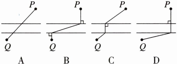 2. 如图,平行河岸两侧各有一城镇 $ P $,$ Q $,根据发展规划,要修建一条公路连接 $ P $,$ Q $ 两镇。已知相同长度桥的造价远大于陆上公路的造价。为了尽量减少总造价,应该选择方案(