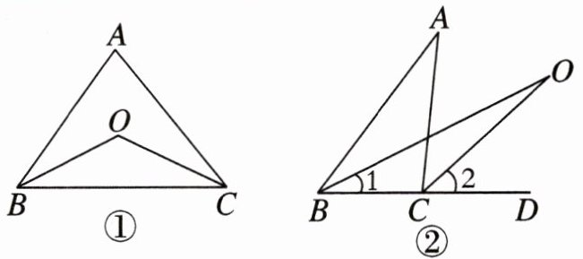 【探究2】如图②,O是$∠ABC$与外角$∠ACD$的平分线BO和CO的交点,试分析$∠BOC$与$∠A$的数量关系;