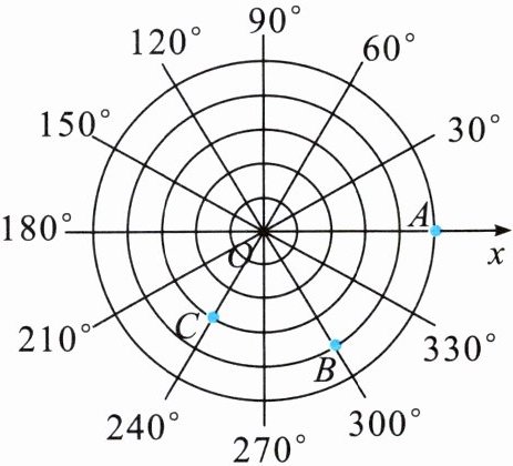 13. 以水平数轴的原点O为圆心,过正半轴Ox上的每一刻度点画同心圆,将Ox逆时针依次旋转$30^{\circ },60^{\circ },90^{\circ },...,330^{\circ }$得到11条射线,构成如图所示的“圆”坐标系,点A,B的坐标分别表示为$(5,0^{\circ }),(4,300^{\circ })$,则点C的坐标表示为____