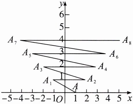 19. (14分)如图,在平面直角坐标系中,已知点A的坐标是$(1,0)$,点A第一次跳动至点$A_{1}(-1,1)$,第二次向右跳动3个单位长度至点$A_{2}(2,1)$,第三次跳动至点$A_{3}(-2,2)$,第四次向右跳动5个单位长度至点$A_{4}(3,2),...$,以此规律跳动下去.