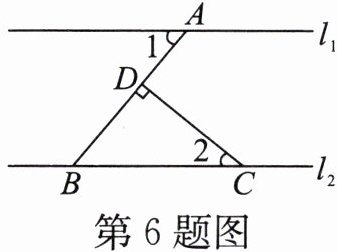 6. 如图,已知直线$l_{1}// l_{2},AB⊥CD$于点D,∠1= 50°,则∠2的度数是(