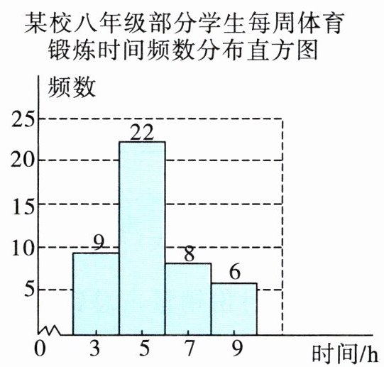 9. 某校对八年级部分学生每周体育锻炼时间进行抽查,得到频数分布直方图(每组含前一个边界值,不含后一个边界值)如图所示,估计该校八年级900名学生每周体育锻炼时间至少为8h的有