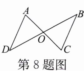 8. 如图,AC与BD相交于点O,且$OA= OC,OB= OD$,则AD与BC的大小和位置关系是