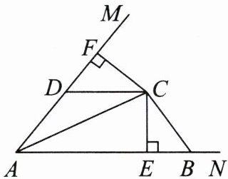 12. 如图,$C是∠MAN$的角平分线上一点,$CE⊥AN$,$CF⊥AM$,垂足分别为$E$,$F$。过点$C作CD// AN$,交$AM于点D$,在射线$EN上取一点B$,使$∠CBE = 2∠DCA$。
