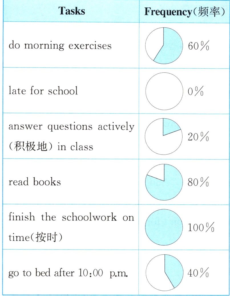 二、同学们参与了“行为打卡”活动,Daniel 正向父母展示自己的记录表。根据表格内容,用合适的频度副词填空,看看他做得如何。