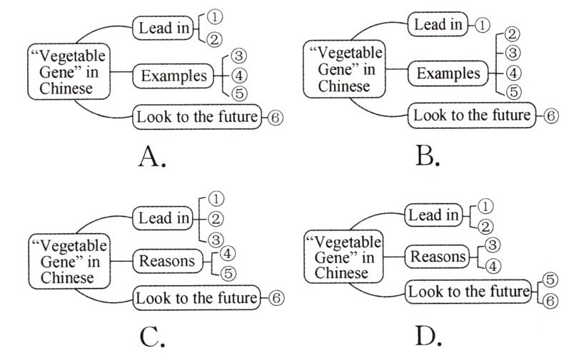 3. A 【解析】通读全文可知,第一、二两段引出中国人有“蔬菜基因”这一话题;紧接着第三至第五段通过列举三个事实证明中国人的“蔬菜基因”;第六段总结全文,展望未来,阐明科技的发展助力中国人在各地种菜。因此 A 项符合文章结构。