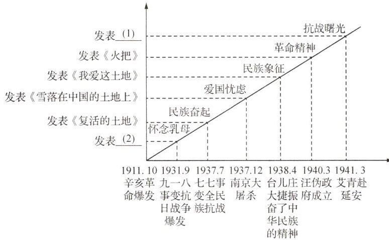 1. 下面是艾青诗歌的发展坐标,横轴为背景,纵轴为艾青的诗作,横轴与纵轴的交点,是艾青诗歌的主题。请根据对以下两首诗歌的了解,将选项 A 或 B 填入纵坐标相应的空白处。(2 分)