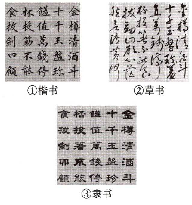 3. 新情境 在参观完碑林博物馆后,你与同学们在建筑上看见了三种用不同字体书写的《行路难》(其一)。你认为哪种书法字体更符合这首诗所表达的思想感情? (4 分)
