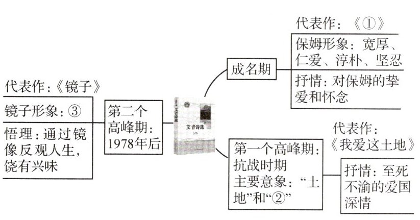 1. 小语同学准备用思维导图向大家推荐艾青写诗的三个时期的代表作品,请你帮忙完善内容。(3分)