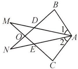 11 已知$△ABN$和$△ACM$的位置如图所示,$∠B=∠C,AD=AE,∠1=∠2$. 求证: