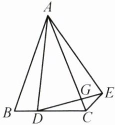 (2)因为∠BAC=∠DAE,所以∠BAD=∠CAE.在△ABD和△ACE中,$\left\{\begin{array}{l} AB=AC,\\ ∠BAD=∠CAE,\\ AD=AE,\end{array}\right.$所以△ABD≌△ACE(SAS),所以BD=CE.因为AD=AE,AC⊥DE,所以AC垂直平分DE,所以CD=CE,所以BD=CD,所以BC=BD+CD=2BD,所以$\frac{BD}{BC}$=$\frac{1}{2}$.