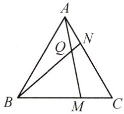 6 如图,$\triangle ABC$为等边三角形,$M$是线段$BC$上的任意一点,$N$是线段$CA$上任意一点,且$BM = CN$,直线$BN$与$AM$相交于点$Q$.