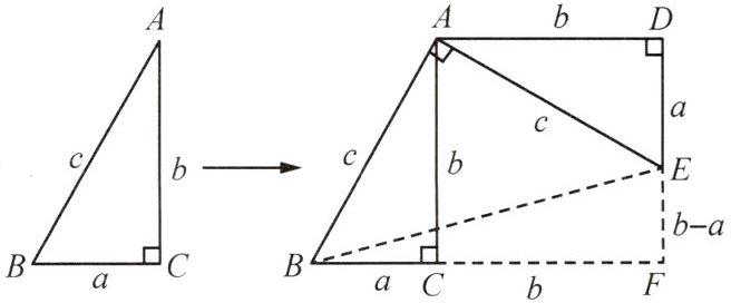 解:由题意,得$S_{正方形ACFD} = b^{2}$,且$S_{四边形ABFE} = S_{\triangle ABE} + S_{\triangle BEF} = \frac{1}{2}c^{2} + \frac{1}{2}(a + b)(b - a) = \frac{1}{2}c^{2} + \frac{1}{2}b^{2} - \frac{1}{2}a^{2}$。因为$S_{正方形ACFD} = S_{四边形ABFE}$,所以$\frac{1}{2}c^{2} + \frac{1}{2}b^{2} - \frac{1}{2}a^{2} = b^{2}$,整理,得$a^{2} + b^{2} = c^{2}$。