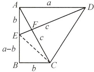 (2)由题意,得$S_{梯形ABCD} = \frac{BC + AD}{2} \cdot AB = \frac{a + b}{2} \cdot a = \frac{1}{2}a^{2} + \frac{1}{2}ab$,且$S_{\triangle CBE} = \frac{1}{2}BE \cdot BC = \frac{1}{2}b(a - b) = \frac{1}{2}ab - \frac{1}{2}b^{2}$。因为$Rt\triangle ABC \cong Rt\triangle DAE$,所以$DE = AC = c$,所以$S_{四边形AECD} = S_{\triangle ADE} + S_{\triangle CDE} = \frac{1}{2}AF \cdot DE + \frac{1}{2}CF \cdot DE = \frac{1}{2}AC \cdot DE = \frac{1}{2}c^{2}$,所以$\frac{1}{2}ab - \frac{1}{2}b^{2} + \frac{1}{2}c^{2} = \frac{1}{2}a^{2} + \frac{1}{2}ab$,整理,得$a^{2} + b^{2} = c^{2}$。