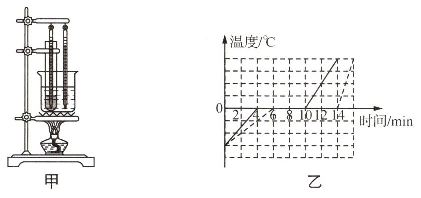 6 (2024南京鼓楼期末)小华做“探究冰熔化特点”的实验时在烧杯和试管中都放入碎冰,并各放一支温度计如图甲所示,两支温度计示数随时间变化的图像如图乙所示,