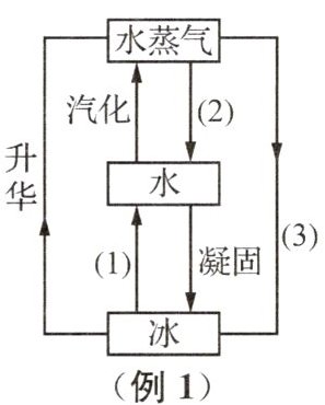 例1 在自然界的水循环中,水的状态发生了变化,如图所示。其中(1)(2)(3)对应的物态变化的名称分别是