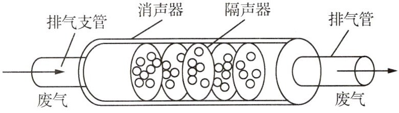 14 新情境 如图所示,汽车的废气离开引擎时压力很大,如果让它直接排出去,将会产生令人难以忍受的噪声,因此需要安装消音器.汽车消音器的剖面如图所示,它里面排列有许多网眼的金属隔音盘.当汽车废气从排气支管进入消音器,经过隔音盘从排气管排出后,废气产生的声音就很小了.其消音的原理是