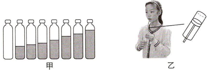例3 (2025南京秦淮期中)在班级开展的“小小音乐会”活动上,两个自制的小乐器吸引了大家的注意,如图甲所示是“水瓶琴”,向8个相同的玻璃瓶灌入不同高度的水,敲击它们会发出不同的声音,如图乙所示为“音调可变的哨子”,在筷子上捆一些棉花,做一个“活塞”,用水蘸湿棉花后插入两端开口的塑料管中,用嘴吹管的上端,也会发出不同的声音,下列说法正确的是(