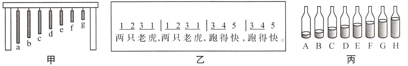 2 (易错题)(2025常州勤业中学期中)小华用金属管自制小乐器,如图甲所示.敲击不同长度金属管,能发出“do(1)”“re(2)”“mi(3)”“fa(4)”“sol(5)”“la(6)”“si(7)”,当她演奏歌曲《两只老虎》(图乙)中的“快”时,应敲击的金属管是