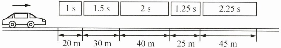 (1)由图中数据可得每段路程的速度为$v=\frac{s}{t}=\frac{20\ m}{1\ s}=\frac{30\ m}{1.5\ s}=\frac{40\ m}{2\ s}=\frac{25\ m}{1.25\ s}=\frac{45\ m}{2.25\ s}=20\ m/s=72\ km/h.$(2)由(1)的计算结果可知汽车可能做匀速直线运动.