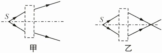 5. (2025 南京金陵汇文学校期中)如图所示虚线方框内各放置一个透镜,发光点 S 发出的两束光通过透镜前后的方向如图所示,若甲、乙透镜的焦距分别为$f_{甲}$、$f_{乙}$,且 S 点距甲、乙两透镜的距离相等,下列说法正确的是 ( )