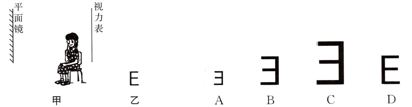 8 检查视力时,视力表放在被测者头部的后上方,如图甲所示,则视力表上如图乙所示的字母在平面镜中的像正确的是 (