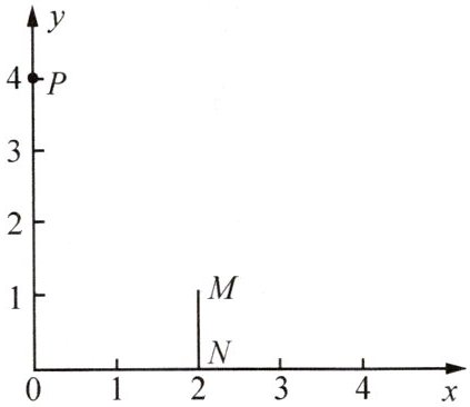 10 跨学科 (2025盐城鹿鸣路中学月考)如图所示,在竖直平面xOy内,发光点位于P(0,4)位置处,平面镜MN竖直放置,其两端M、N的坐标分别为(2,1)和(2,0),发光点P在镜中的像$ P _ { 1 } $坐标为(