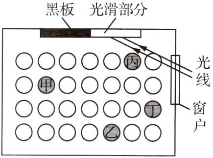 例3 (2025常州金坛期中)教室内的黑板用久后变光滑的部分容易发生镜面反射,使部分位置处的学生看不清黑板上的粉笔字.如图所示,当太阳光按照图中情形射入时,最有可能看不清粉笔字的位置是(