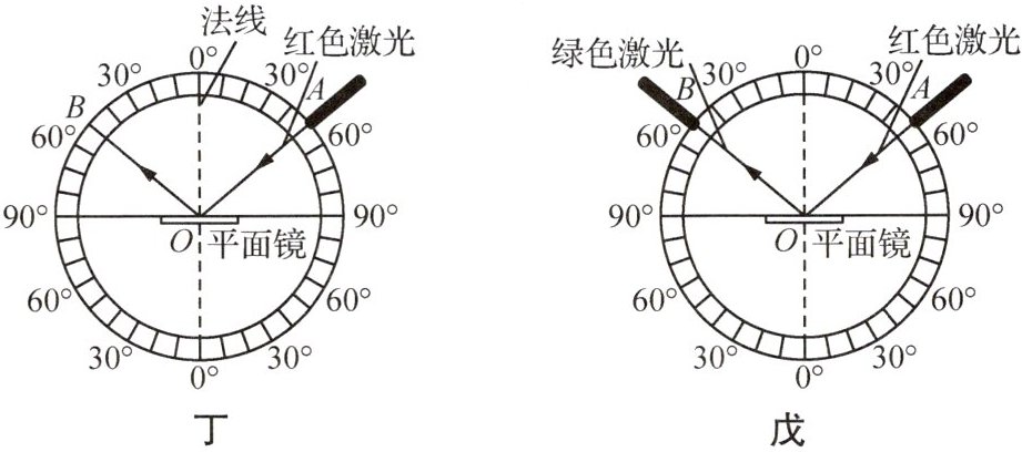 (4)如图戊所示,若使绿色激光沿着BO方向射向镜面O点,则可以观察到绿色激光沿着OA方向射出现象,这说明