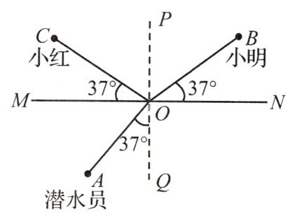 D.潜水员观察小明的像对应的光路中,OA是折射光线,折射角为$37^{\circ }$