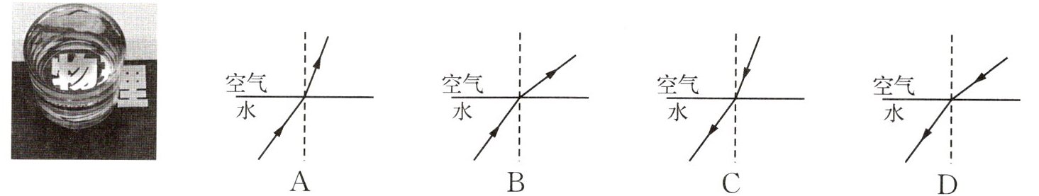 6 (2025南京联合体期中)把玻璃杯放在有字的卡片上,往杯内注水近满,如图所示,由上向下观察,比较你看到的杯外和杯内的文字.下列选项图能正确解释此现象的是 (