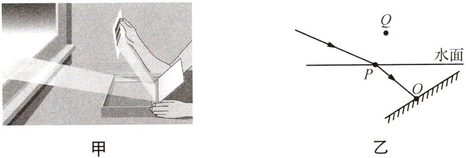 10 如图甲所示将平面镜斜放入水中,让太阳光照射在水下的平面镜上,并反射到白纸上就能形成色散.图乙中P点为某一束光人射到水面的点,O点为光折射后在镜面上的人射点,Q点代表白纸.请在图中画出光到达Q点的光路图.