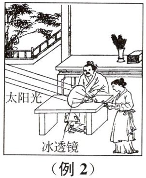 例2 跨学科(2025盐城康居路初中期中)公元前2世纪,西汉淮南王刘安的《淮南万毕术》记载:“削冰令圆,举以向日,以艾承其影,则火生”,其描述的现象如图所示,下列说法正确的是(