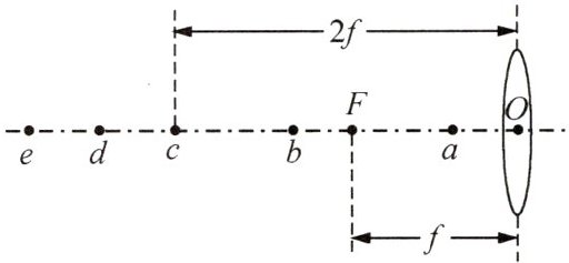 1 在探究凸透镜成像规律的实验中,如图所示,将点燃的蜡烛先后置于$a$、$b$、$c$、$d$、$e$各点,并移动光屏,在屏上得到清晰的像,则:
