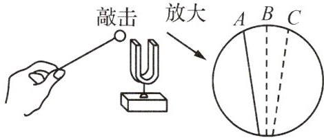;小铭敲击一个音叉,如图所示.现放大音叉的右臂,那么此音叉臂从最左端A位置经过B位置到达C位置后,再由C位置再次经过B位置返回最左端,这样叫作振动一次.如音叉右臂振动频率为30Hz,则1s内音叉右臂会经过60