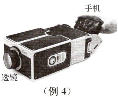 例4 (2024黄岛模拟)如图所示是科技兴趣小组用手机、透镜和纸箱自制的简易投影仪,它能将手机上的画面放大投影到白墙上. 下列说法正确的是 (